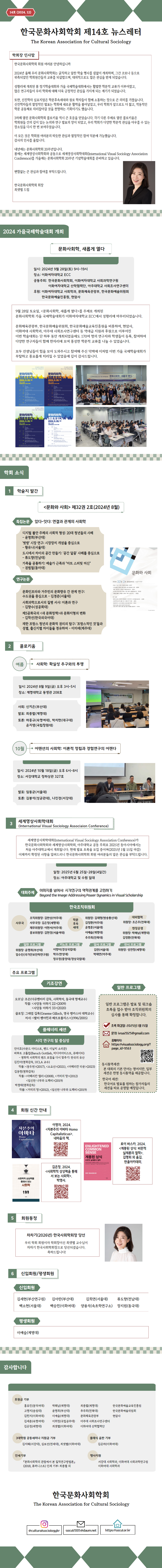 한국문화사회학회 뉴스레터 제14호(2024년 12월)가 나왔습니다.