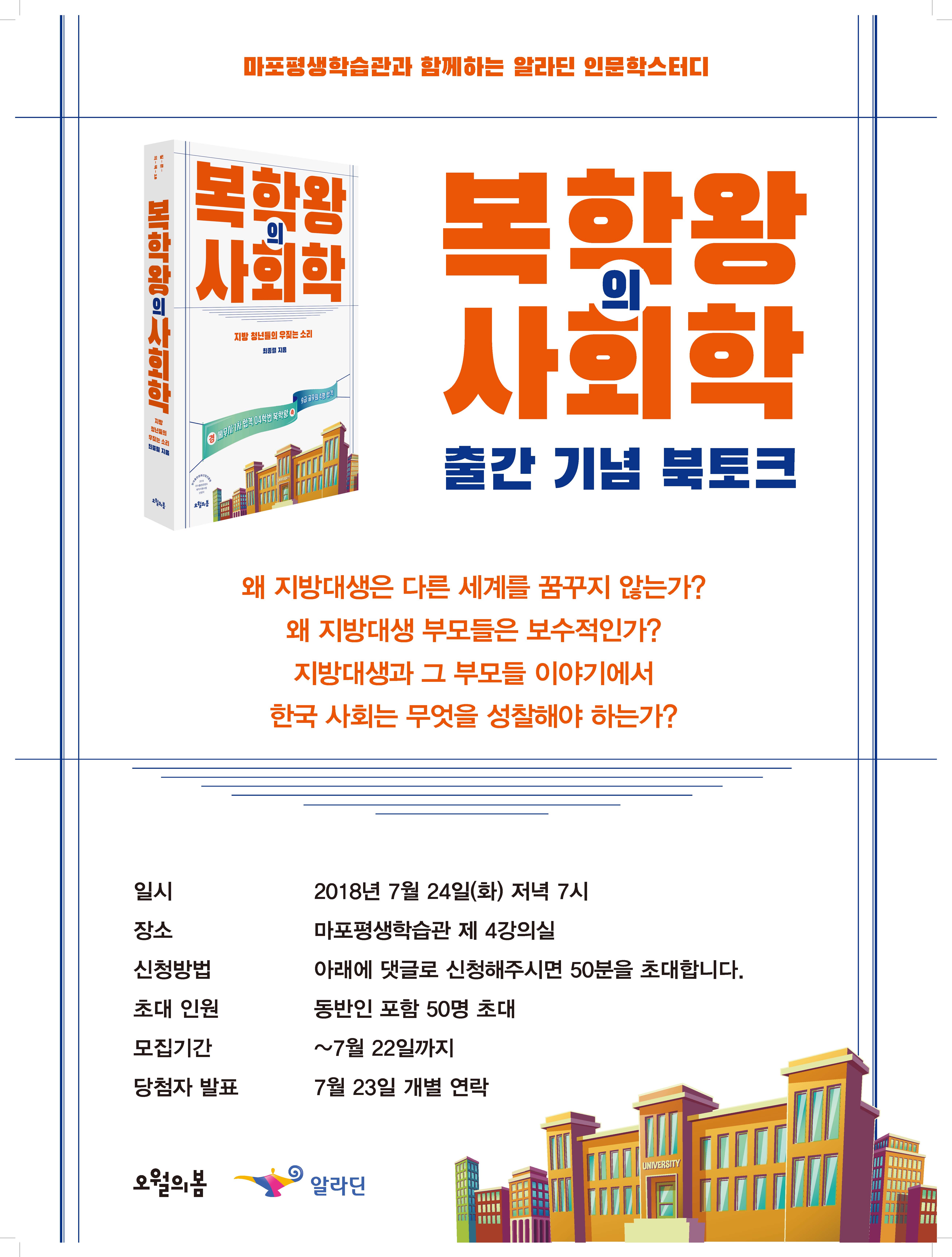 한국문화사회학회 최종렬 부회장님께서 신간 <복학왕의 사회학> 출간 기념 북콘서트를 여십니다.