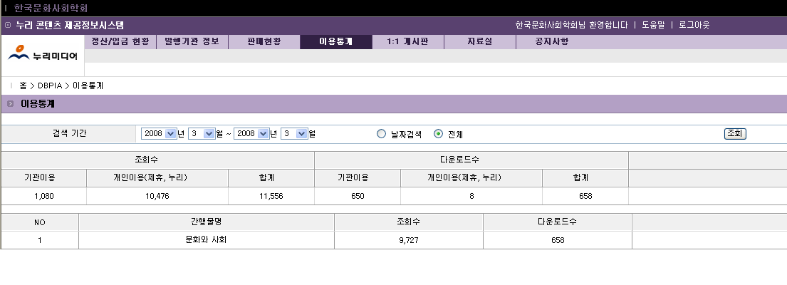 아시다시피 <문화와 사회>가 전자저널화 되어 있는데요...오늘 우연히 이용통계를 들여다 보다가 편집위원분들도 한번 보시면 좋겠다는 생각이 들어 올립니다. 판매액수도 9400 원 정도 되는 것 같더군요. ^^ 참고하시길요... (첨부 화일 열어보시면 됩니다.)